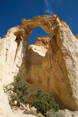 | The dirt roads around Kodachrome State Park are accessible with normal 2WD vehicles. Once you continue on from Kodachrome Basin to the Grosvenor Arch you may need a 4WD, especially if it rains or even if there a storm clouds nearby. There is a deep wash you’ll need to cross immediately after a 35 MPH sign. Watch out for that one, especially if you happen to be driving 35 MPH! It comes up fast. The Grosvenor Arch is interesting to see but it’s a long way to go on a rough road. I didn’t see any suitable areas to camp since the road passes through lots of private ranch land. |  The Grosvenor Arch |